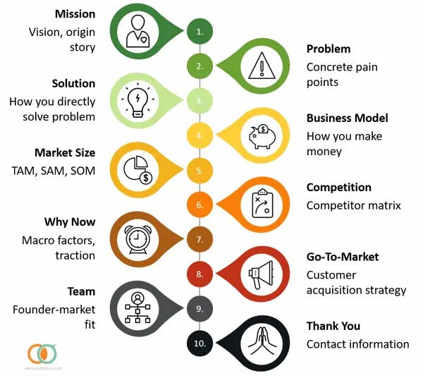 Each of those ten slides is a lot of work. How can you demonstrate the problem you are solving, and how do you effectively communicate the market opportunity? The character (the content) is really where pitches can be lost and won.