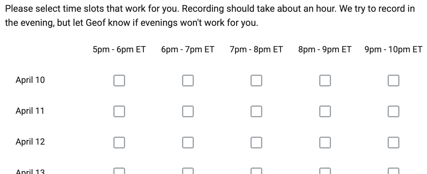 One way to easily schedule dates is to use a Google Form with a grid survey question. You can see in the example below for how we ask guests to pick times on dates using a survey grid: